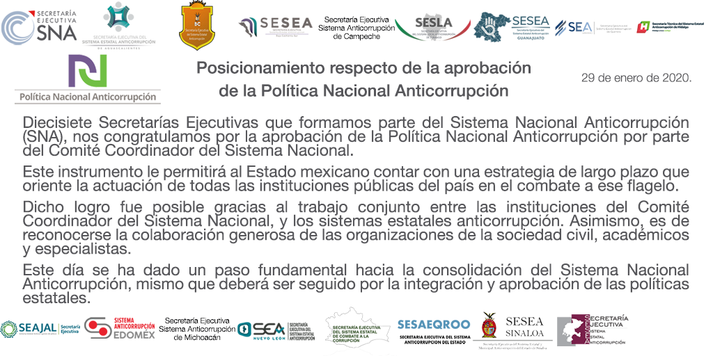 Dieciséis Secretarías Ejecutivas que formamos parte del Sistema Nacional Anticorrupción (SNA), nos congratulamos por la aprobación de la Política Nacional…
