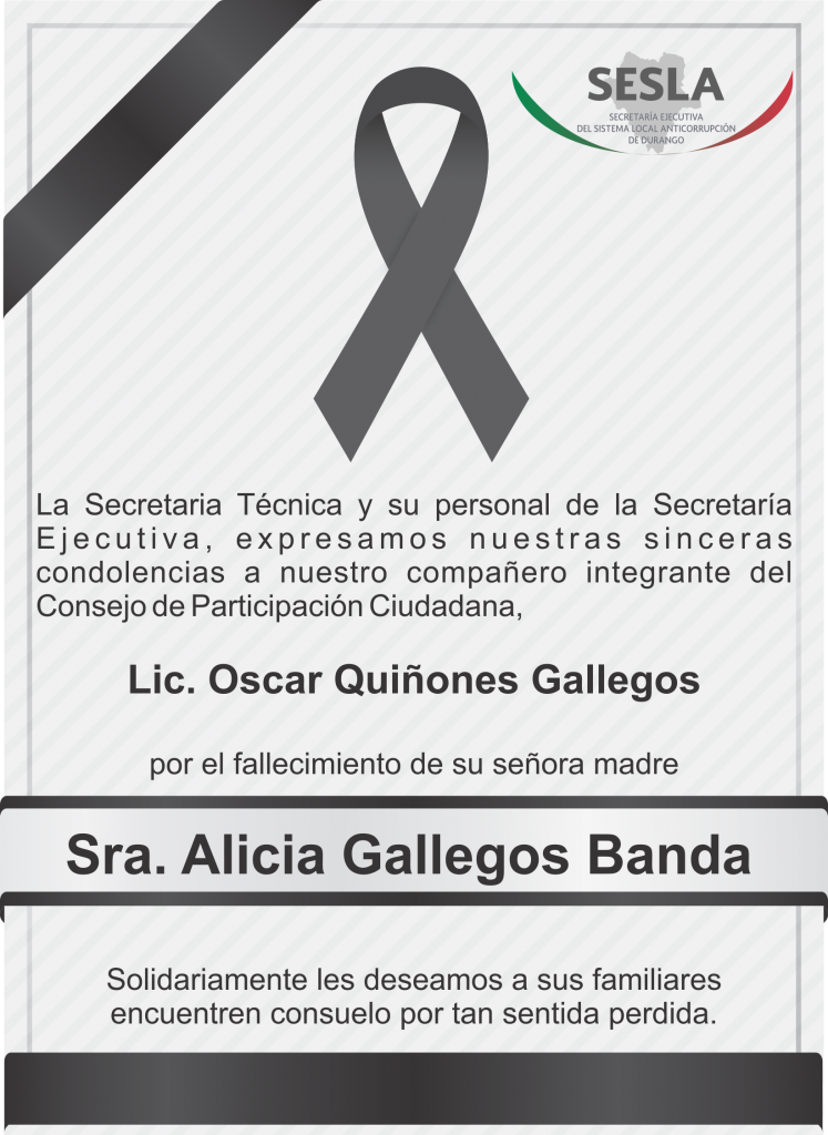 La Secretaria Técnica y su personal de la Secretaría Ejecutiva, expresamos nuestras sinceras condolencias a nuestro compañero integrante del Consejo de Participación Ciudadana, Lic. Oscar Quiñones Gallegos por el fallecimiento de su señora madre